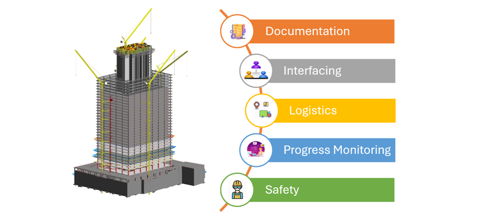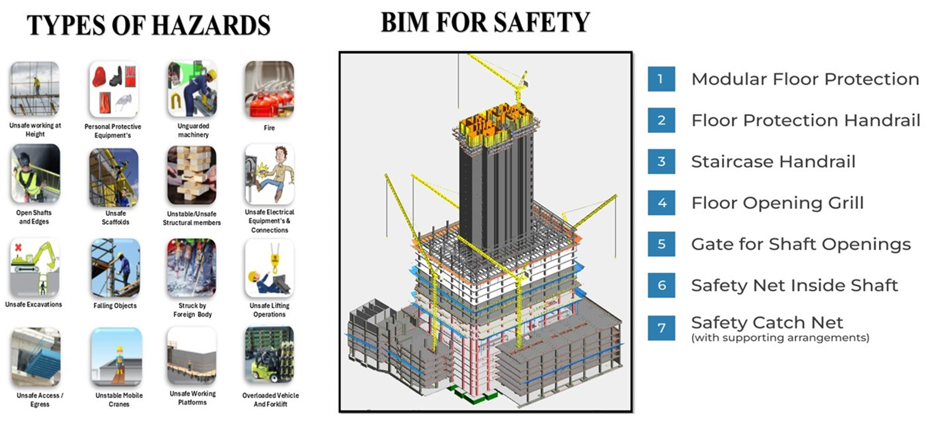 BIM for safety is an innovative process in the construction industry that enhances safety by planning resources for fall protection, emergency evacuation, and traffic management. It enables quick identification and mitigation of hazards related to design changes. Additionally, it improves compliance tracking, employee awareness, and logistics management, ultimately boosting efficiency, time and cost optimization.