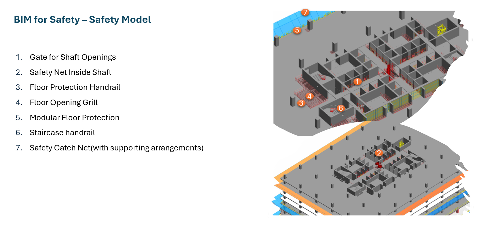 In the 3D model, we have developed safety elements tailored to site requirements in collaboration with the EHS manager and BIM coordinator. After modeling these safety elements, we assign simulation IDs to them similar to the structural 4D simulation.