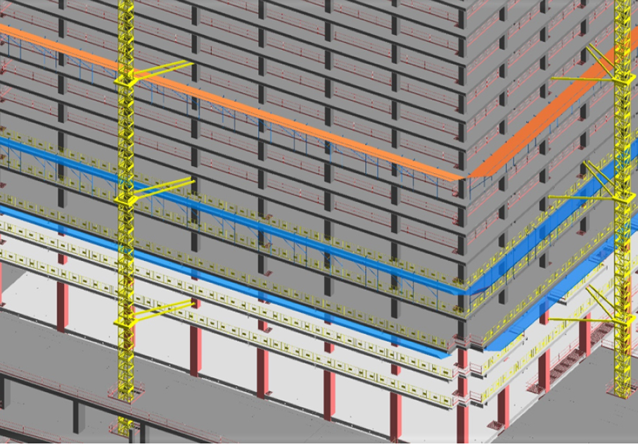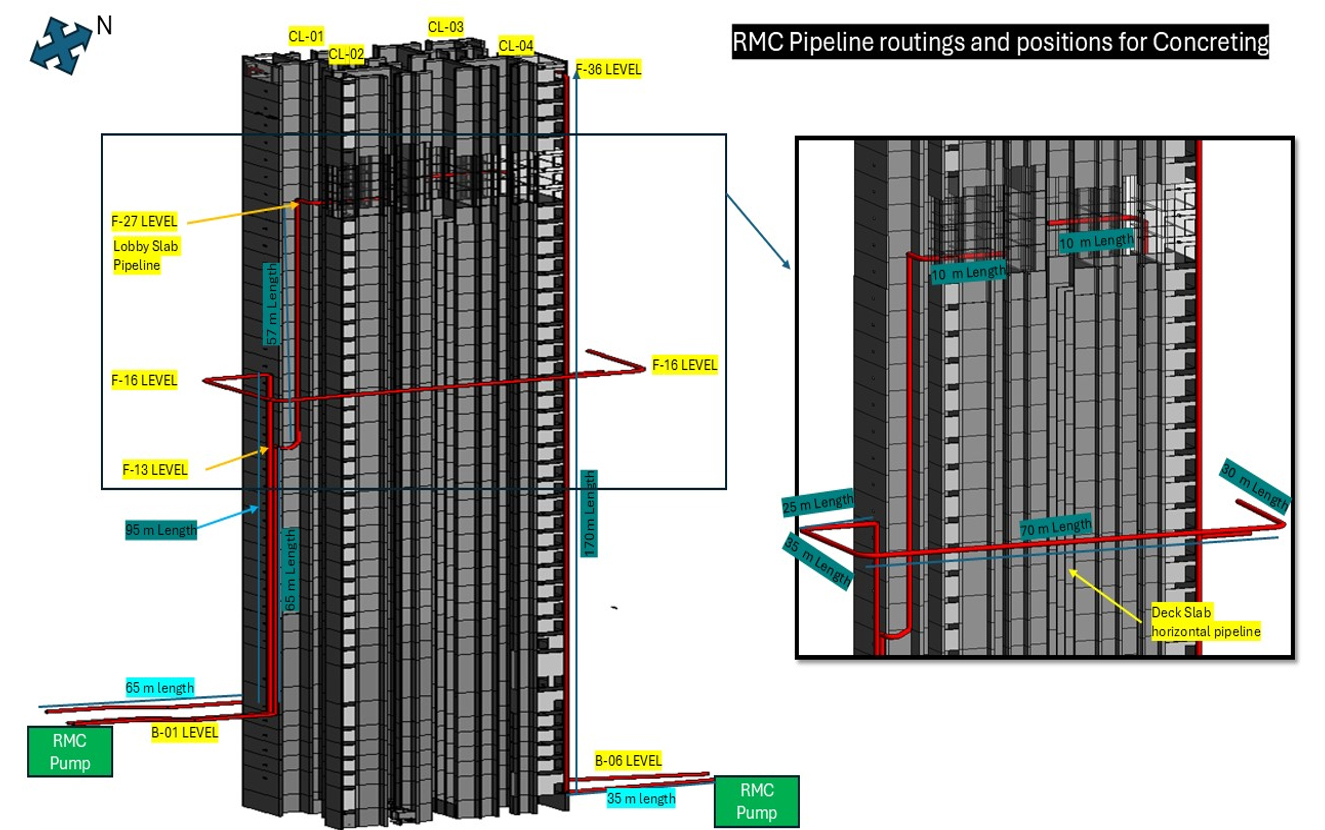 As the height of a structure increases, we encounter challenges with the location and routing of pipelines. If not managed properly, concrete can clog the pipelines, leading to delays in completing the concrete work. To prevent this issue, it’s essential to conduct a digital rehearsal or analysis that visualizes the pipeline routings in the 3D model. This allows for better visualization and helps us plan the pipeline routes according to site. By creating a thorough plan before starting concrete work on-site, we can avoid delays and ensure that planned activities proceed smoothly.