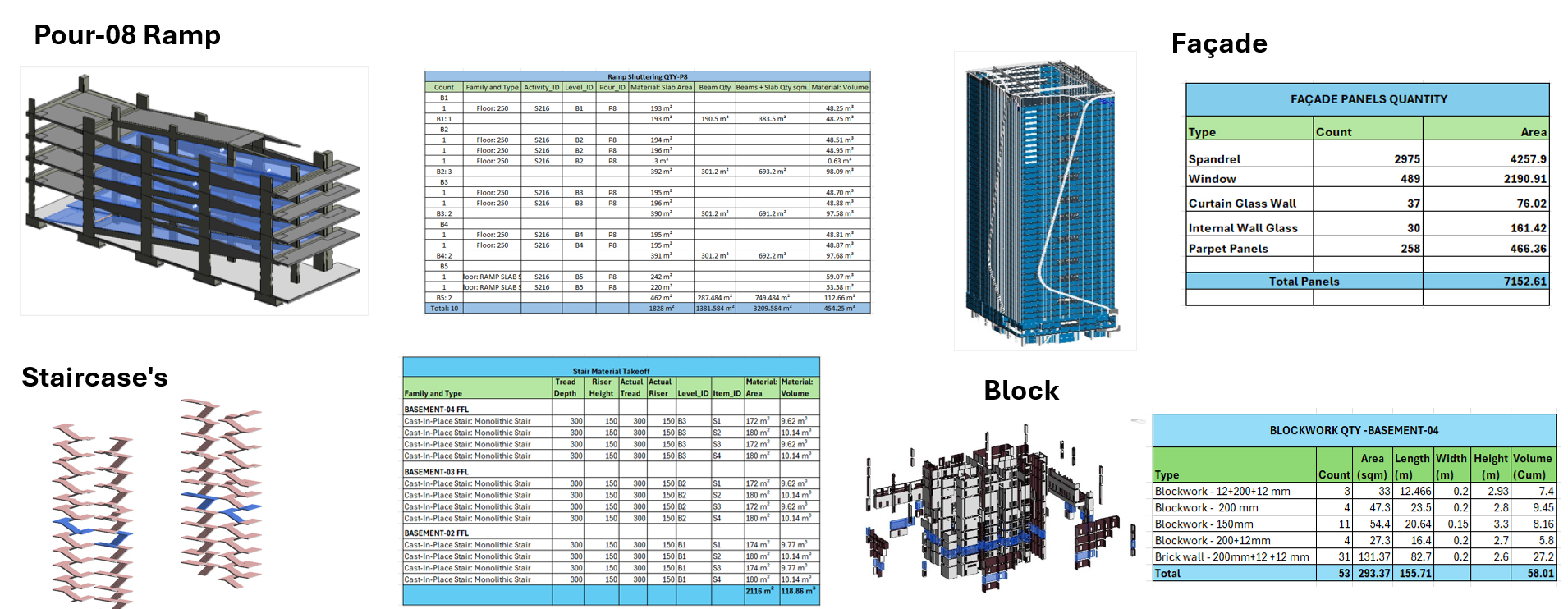 Concrete QTO for all major pours and critical elements of structure is generated using BIM. Staircase Quantity calculation takes around 1 hour for Site Engineer/Manager in traditional way, however QTO using BIM takes less than 10 minutes thus saving time for execution team.