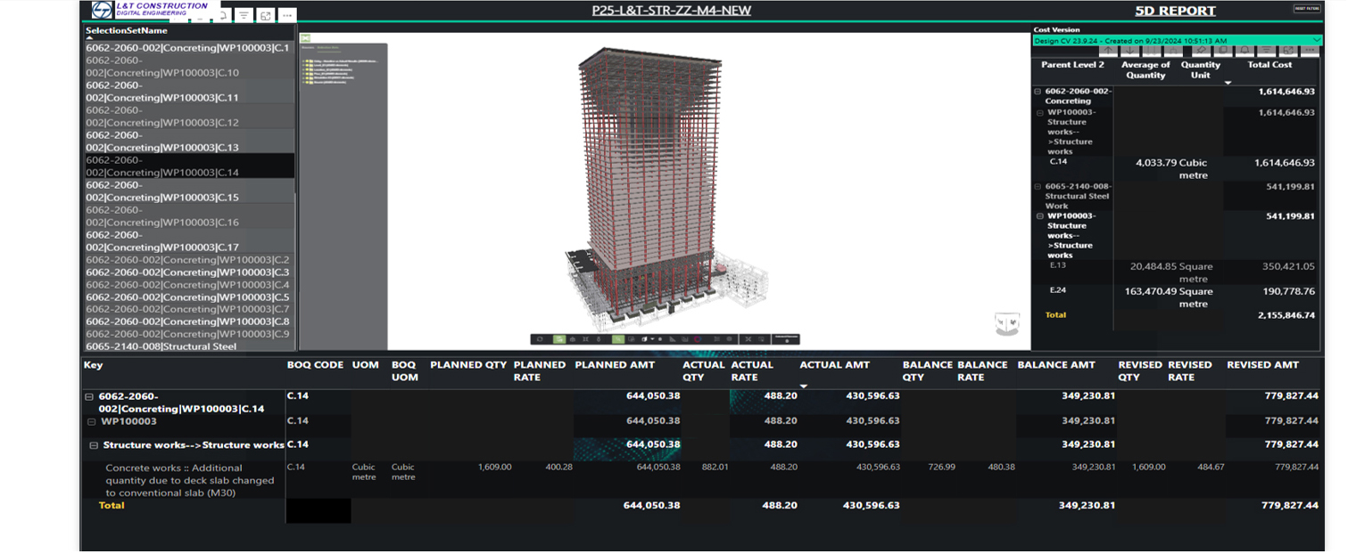 The 5D BIM interactive dashboard, created using Bexel CDE and Power BI, empowers the project team to view quantities with just a click. These dashboards can be easily sliced based on time and Project WBS, offering a dynamic and user-friendly interface for efficient project management.