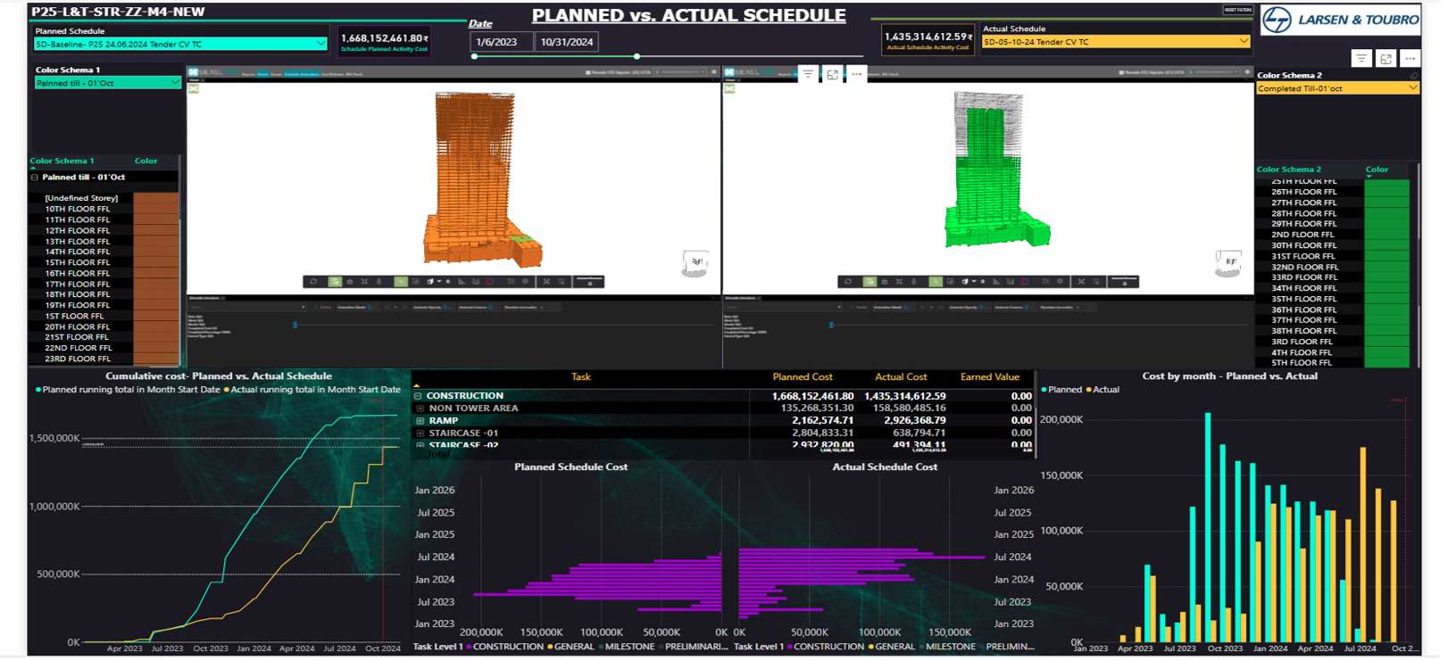 Linking 4D model with Cost in the Bexel manager software we can visualize the Planned V/s Actual along with Cost data by using Power BI Dashboard