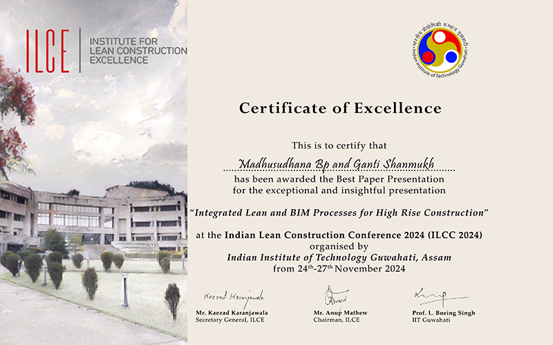 I had the privilege of presenting our paper, “Integrated Lean and BIM Processes for High-Rise Construction,” which focuses on implementing BIM on-site. The paper discusses how we can optimize issues such as documentation, logistics, safety, progress monitoring, and coordination with other disciplines. It also highlights strategies to minimize time and costs by reducing waste and maximizing value. This work earned us the Best Paper Presentation Award for 2024 at ILCC.