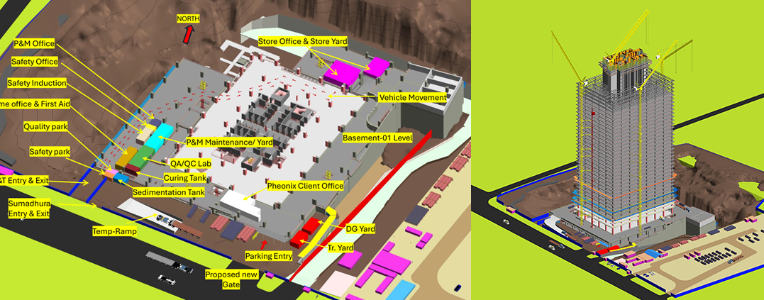 We developed a detailed site logistics simulation using Fuzor, highlighting the project's location near the main road. The simulation showcases vital infrastructure, including a temporary ramp, various storage areas, a plant and machinery yard, and offices for sub-vendors.