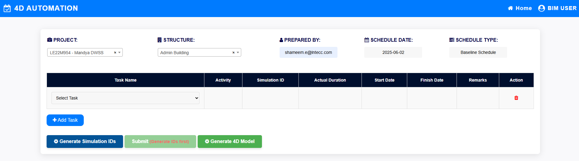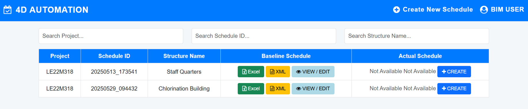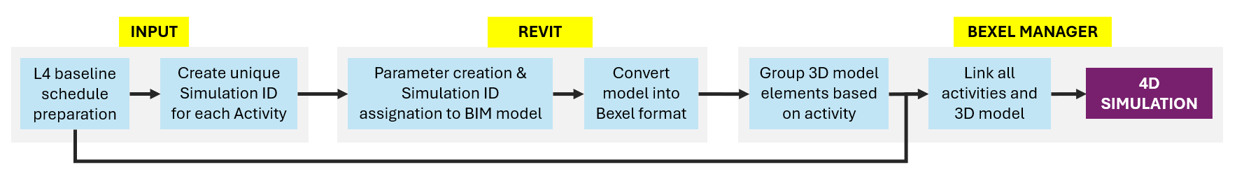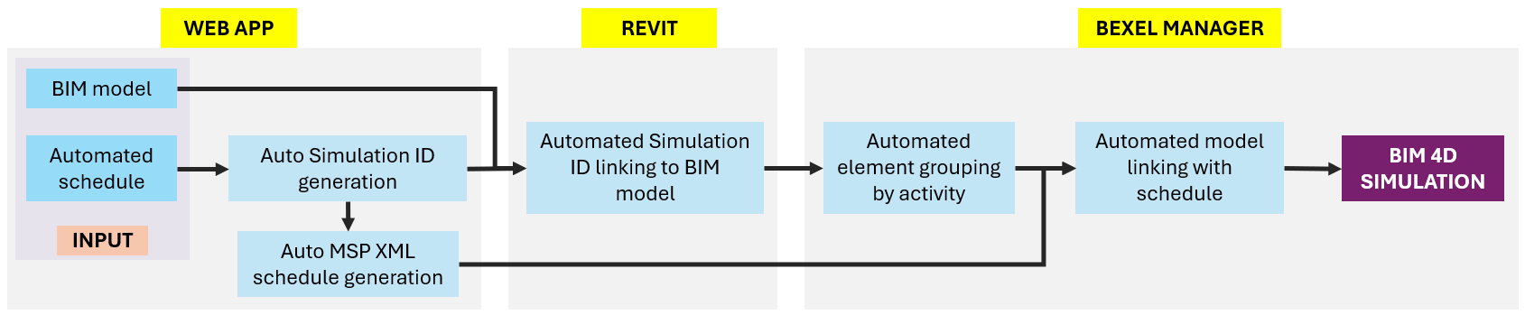 To address the limitations of traditional 4D workflows, a comprehensive automation pipeline was adopted, streamlining every critical stage from schedule creation to 4D BIM simulation. This workflow eliminates repetitive manual tasks, ensures consistency across platforms, and significantly reduces the time required to generate accurate BIM 4D simulations. This solution is deployed with a web app for scheduling and Custom Add-ins for Revit and Bexel Manger for the automation of internal operations.