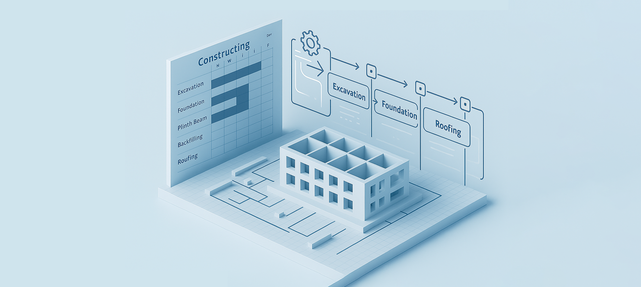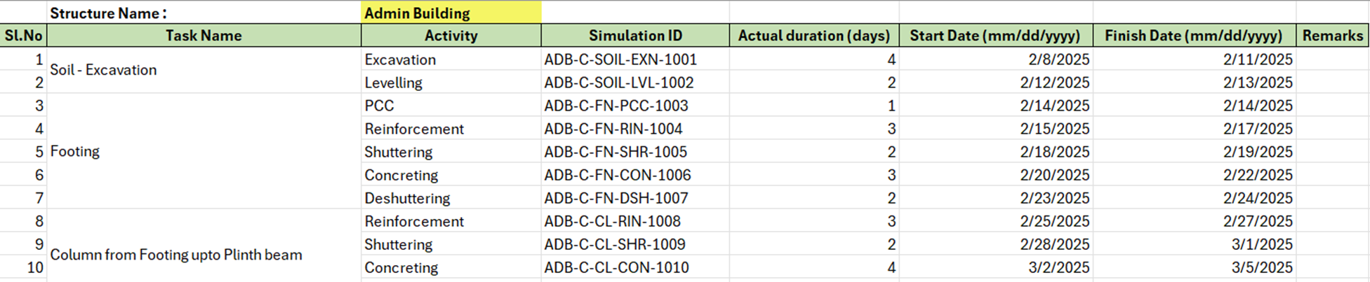 The process begins with a web application for automated schedule preparation. Unlike traditional methods where users manually type task details, this application requires no direct data input. Instead, users simply select task names from a predefined dropdown list. Once a task is selected, all associated activities are automatically populated in a structured, hierarchical order. This eliminates typing errors and ensures schedule consistency, making it possible to prepare even complex construction schedules rapidly and with minimal effort.