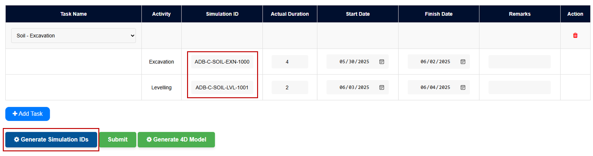 In addition to baseline schedule generation, the web application also supports the creation and editing of actual schedules. By referencing the previously generated baseline schedule, users can efficiently update task progress and enter actual start and finish dates. This extended functionality enables seamless delay analysis using the 4D model. This capability empowers project teams to visually compare planned versus actual progress within the 4D environment, enabling data-driven decisions and proactive project control.