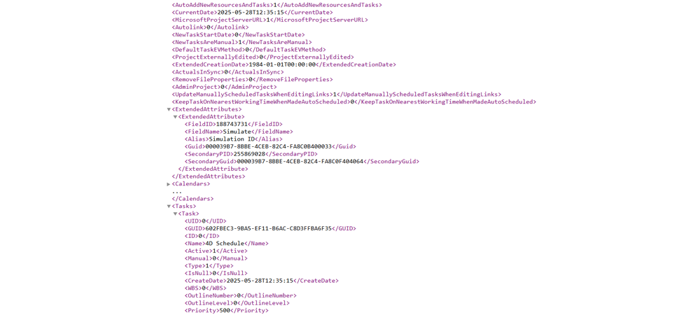Since 4D platforms like Bexel Manager require the schedule to be in a specific format (Microsoft Project or Primavera), the workflow includes automated conversion of the created schedule into MSP-compatible XML format. This conversion ensures that the schedule can be imported directly into the 4D modeling software without additional formatting or manual intervention. Once the schedule is submitted, An MSP compatible XML schedule file and an excel based schedule file will be generated and the user must attach the input Revit file for parameter assignation.